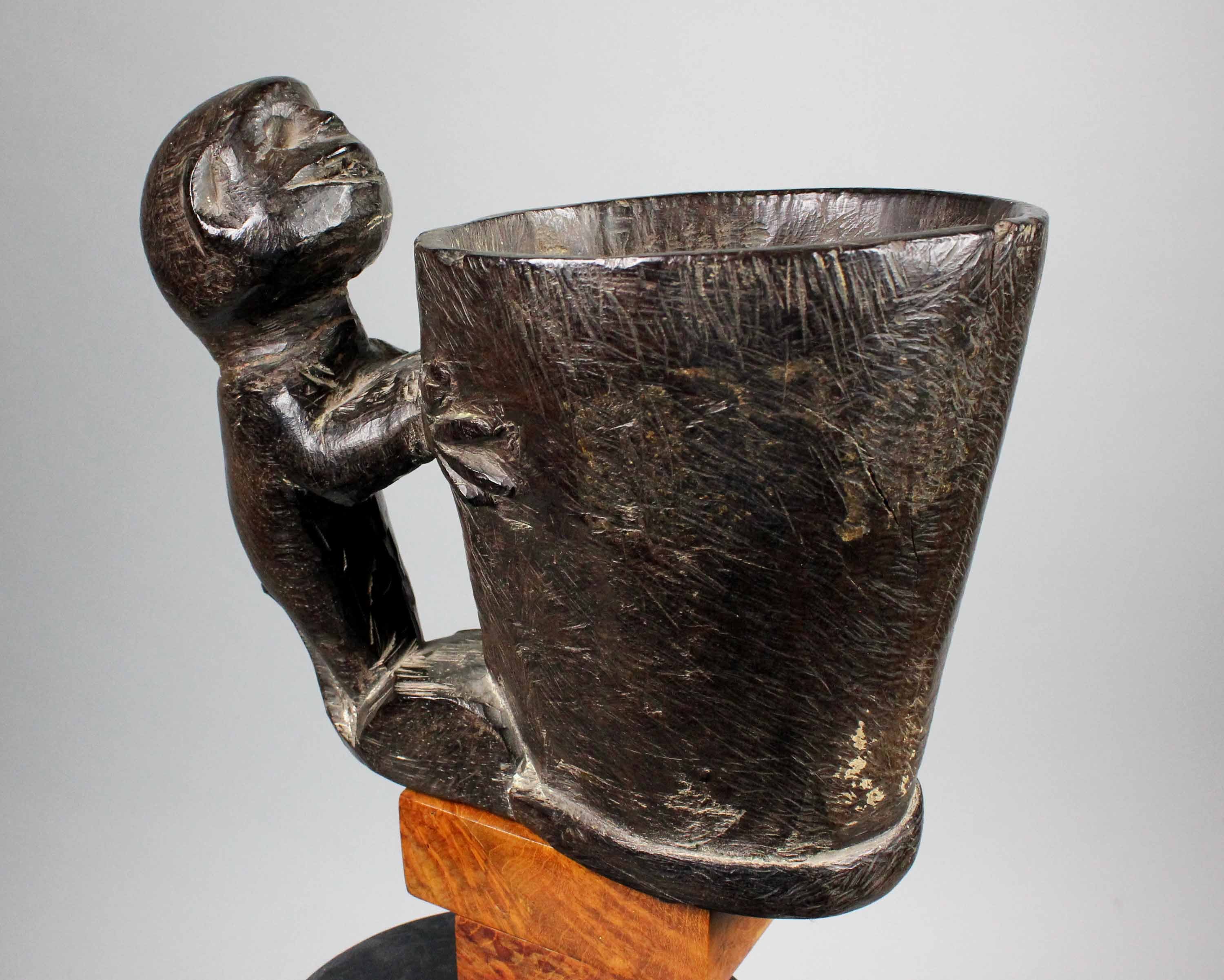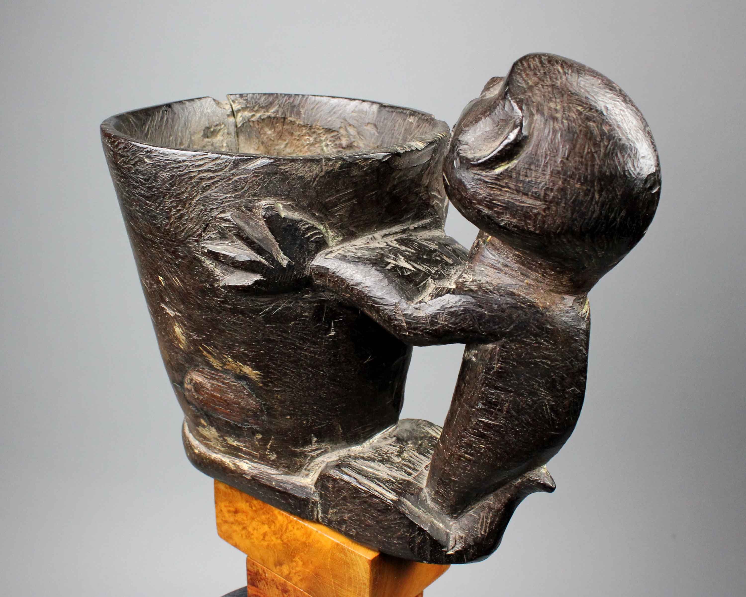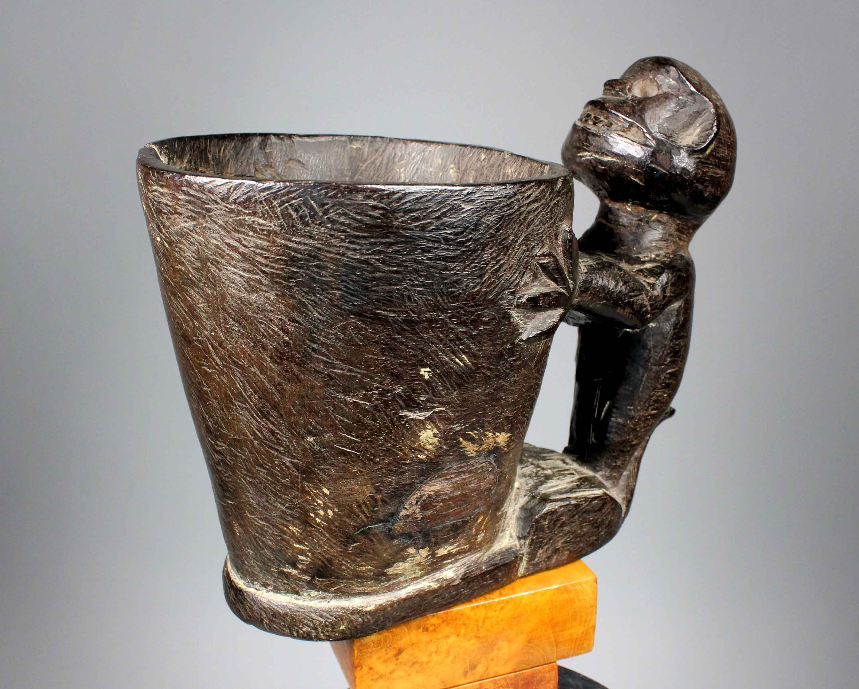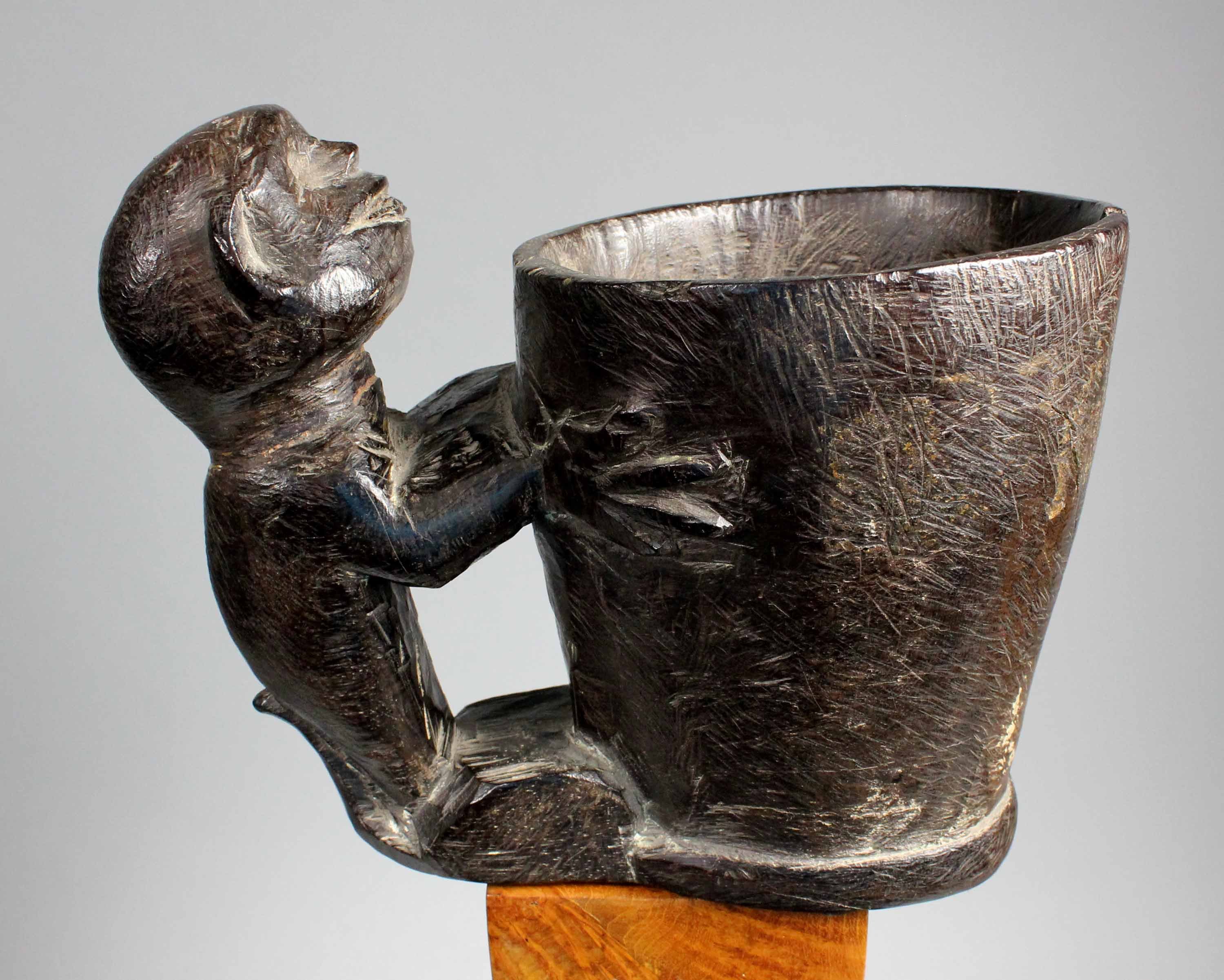 With simian figure, hanging on the side, used as the handle.
